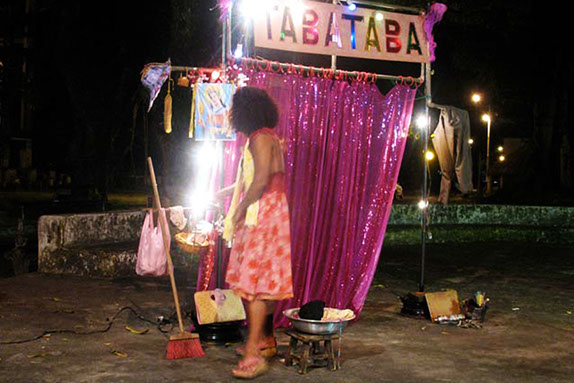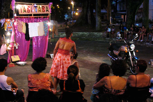 Parrallèlement à la création dee Combate de negro et caes, autre(s) jeu(x) de langue, autre pièce, autre démarche. Spectacle court, léger et nomade à installer partout ; dans les jardins du Teatro Vilha Vella ou de La Fondation Pierre Verger ,« hors les murs », dans les cours et les ruelles des favelas, dans les cités, les parcelles, les bars, les préaux d’écoles, les universités, ou chez Carlinhos Brown. Mais aussi sous un arbre, au bord de l’eau, sur le bitume, ou dans la poussière. Conçu pour être représenté à n’importe quelle heure du jour et de la nuit ; l’après-midi, au crépuscule, à l’aube. Tabataba témoigne d’une certaine idée de l’art du théâtre. Immédiatement, s’opère « un vivre ensemble ». Les spectateurs se mélangent ; habitants du quartier, voisins-voisines, passants, curieux, associations, commerçants, prostituées, policiers, gamins après l’école, poules et chats. C’est du théâtre fait pour la scène, et la scène est la rue.